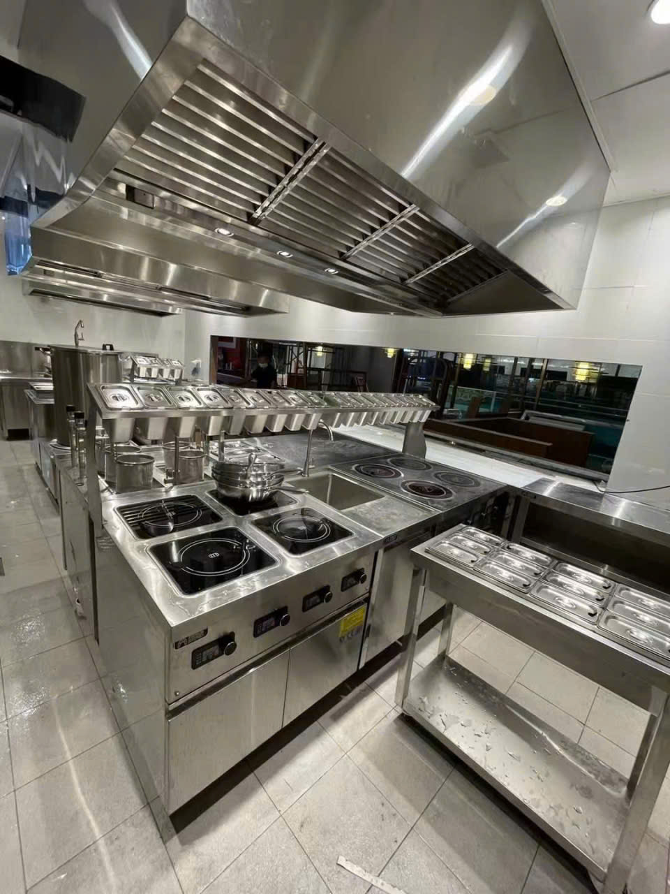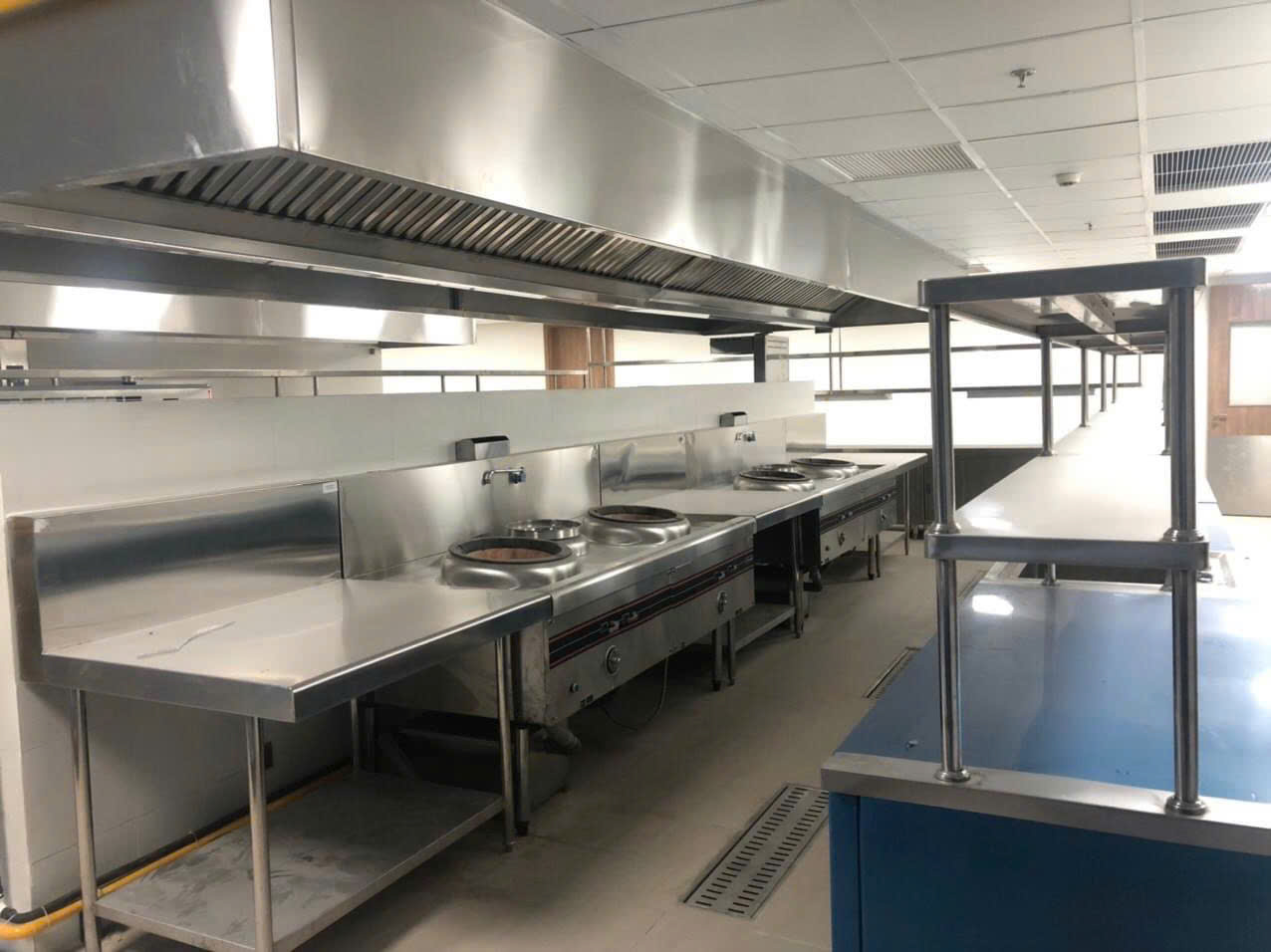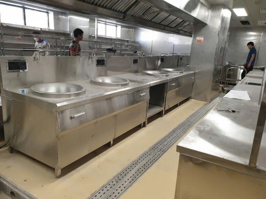 - Khu bếp nấu: Bếp nấu căn tin trường học bệnh viện có thể là các thiết bị bếp Á 1 họng, 2 họng, bếp Âu, 2-4 họng dùng gas. Hoặc dùng các loại bếp từ liền chảo, bếp từ mặt phẳng. Và có thể trang bị các thiết bị khách như: bếp chiên, bếp nướng, lò nướng, nồi nấu phở, tủ hấp cơm, tủ hấp bánh bao,… Ngoài các thiết bị nấu thì còn có các thiết bị inox khác như bàn inox, kệ inox, hệ thống hút khói và mương vỉ thoát sàn